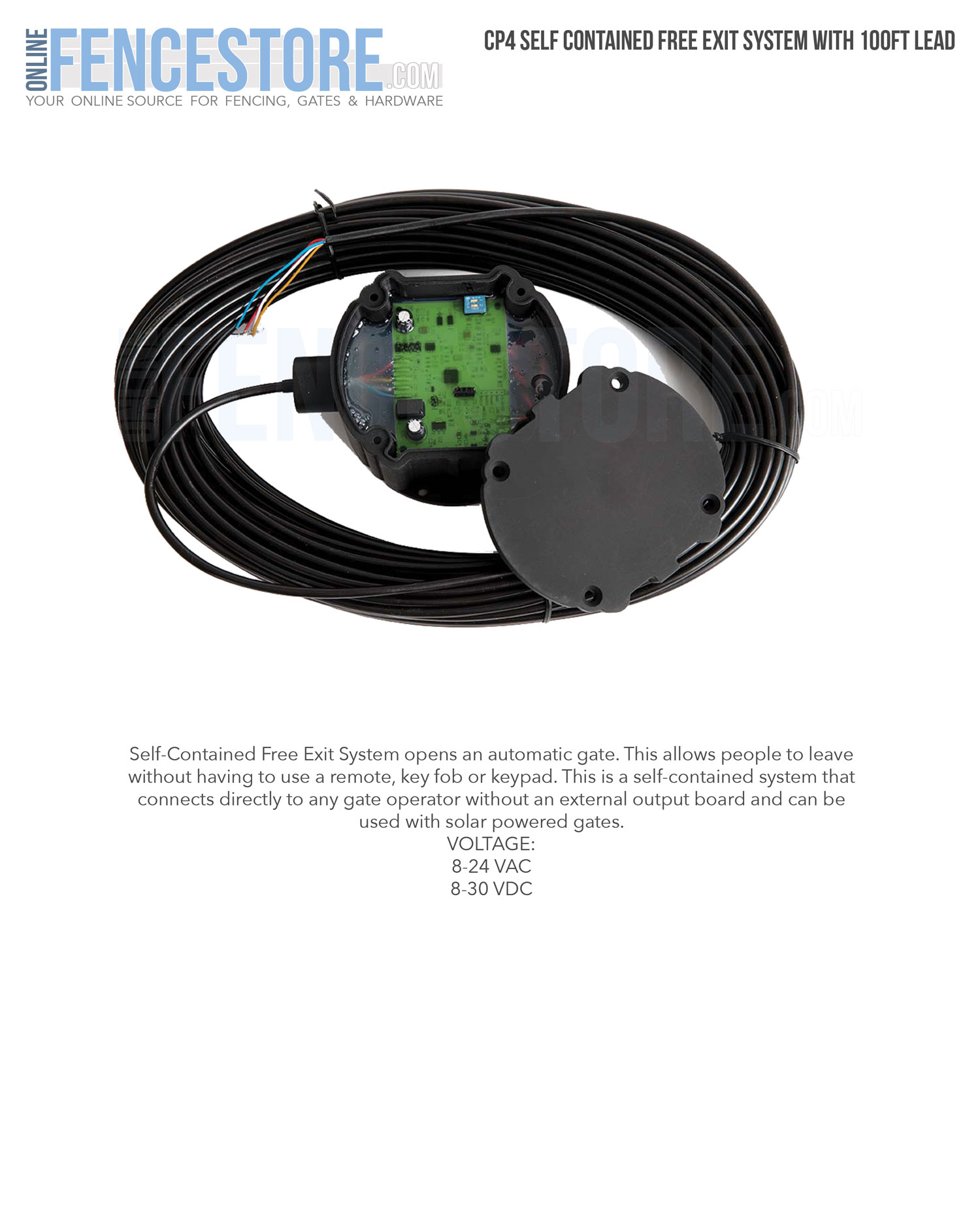Self-Contained Free Exit System opens an automatic gate. This allows people to leave without having to use a remote, key fob or keypad. This is a self-contained system that connects directly to any gate operator without an external output board and can be used with solar powered gates.