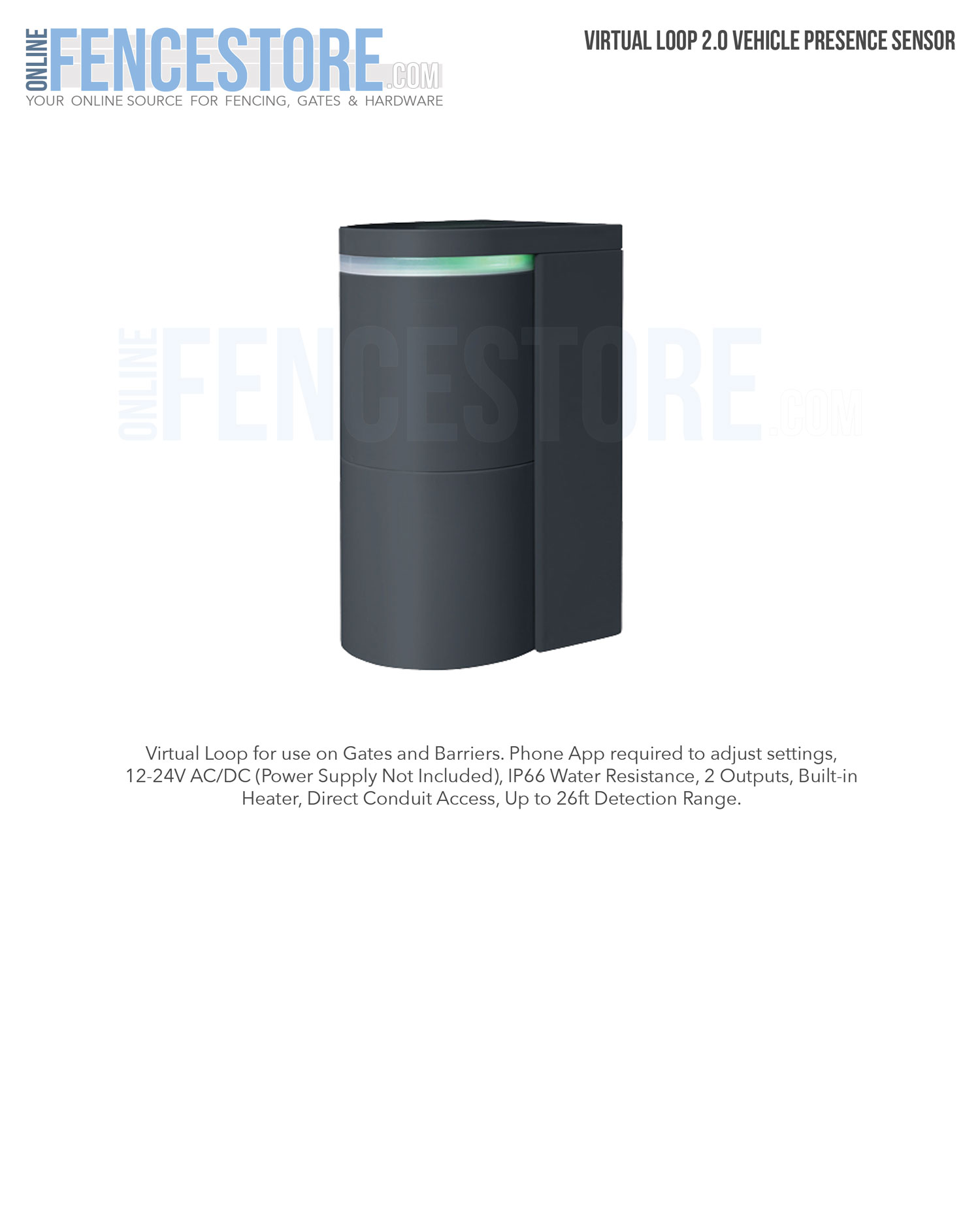 Virtual Loop for use on Gates and Barriers. Phone App required to adjust settings, 12-24V AC/DC (Power Supply Not Included), IP66 Water Resistance, 2 Outputs, Built-in Heater, Direct Conduit Access, Up to 26ft Detection Range.